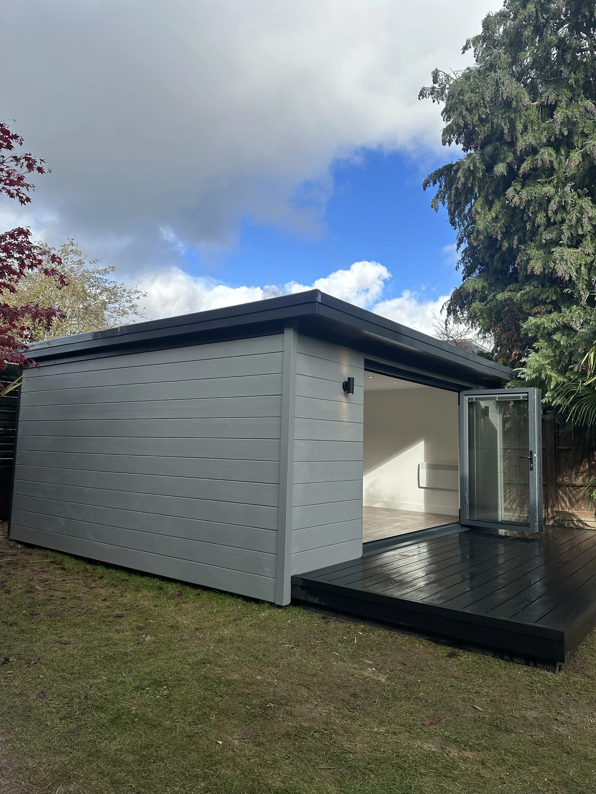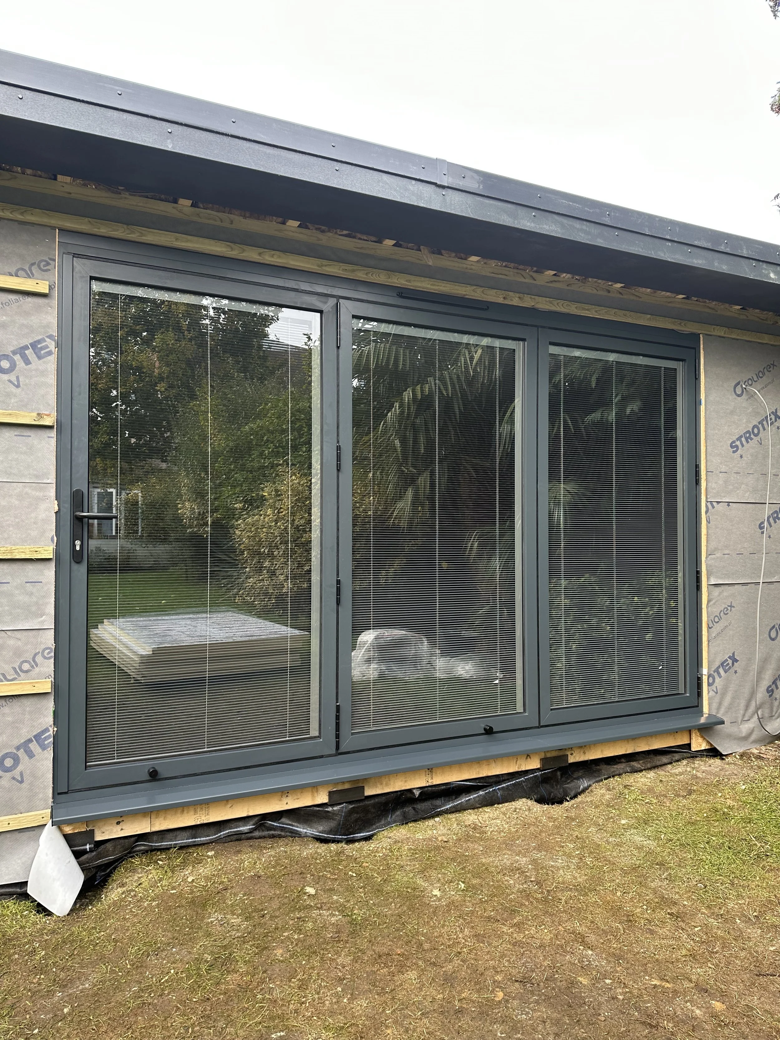 Aluminium bi-fold doors with Canadian western red Cedar finish.